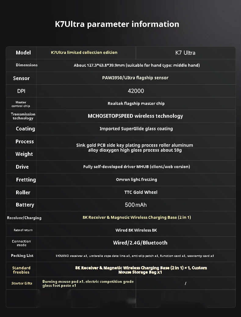 El MCHOSE K7 Ultra es la elección ideal si buscás un mouse rápido, preciso y con calidad profesional. Su sensor PAW3950 Ultra y sus 42,000 DPI garantizan una precisión impecable en cualquier juego, mientras que su respuesta real de 8KHz —tanto alámbrica como inalámbrica— te da una velocidad que muy pocos mouse del mercado pueden ofrecer. Con solo 59 g de peso y un diseño premium con vidrio Super Glide y switches ópticos Omron, cada movimiento se siente suave, ligero y totalmente controlado. Además, su batería de larga duración y la base de carga magnética hacen que usarlo sea cómodo y práctico todos los días. A esto se suma su triple conectividad y el software M Hub, que te permite personalizar DPI, macros y perfiles a tu gusto. Si querés un mouse que marque diferencia desde el primer uso, el K7 Ultra es una compra segura.